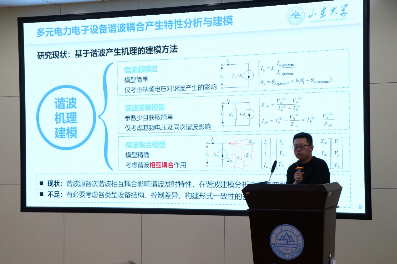 李亚辉以“新型电力系统多元源荷谐波特性及建模分析”为题,从研究背景、谐波耦合产生特性分析与建模、多元源荷特性分析与谐波模型构建、谐波特性及影响分析和总结与展望五部分进行汇报。李亚辉谈到,谐波相互耦合,有必要考虑各类型设备结构、控制差异,构建形式一致性的多类型谐波源分析模型。他还从摘要、引言和内容等五个方面介绍论文的写作以及期刊、会议论文和专利的多角度对比,勉励同学们打好基础,知难而进,坚持不懈。