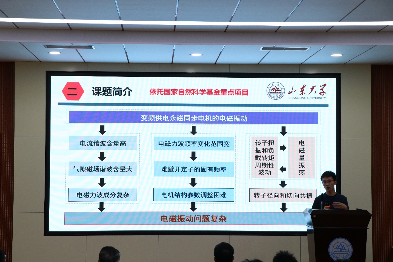 论坛伊始,邢泽智以“永磁同步电机电磁振动关键基础问题研究”为题,从个人基本情况、课题简介、博士期间主要成果和总结四方面进行汇报。他指出,当下由于变频供电永磁同步电机的电磁振动,使电磁振动问题日趋复杂,现有分析方法存在明显短板。因此,博士期间他提出子域法和磁动势-磁导法相结合的电磁力波快速准确计算方法、基于能量法的定子固有频率快速准确计算方法和利用线性叠加原理得到不同频率电磁力作用下定子的振动响应等来解决电磁振动的难题,取得一系列杰出成果。