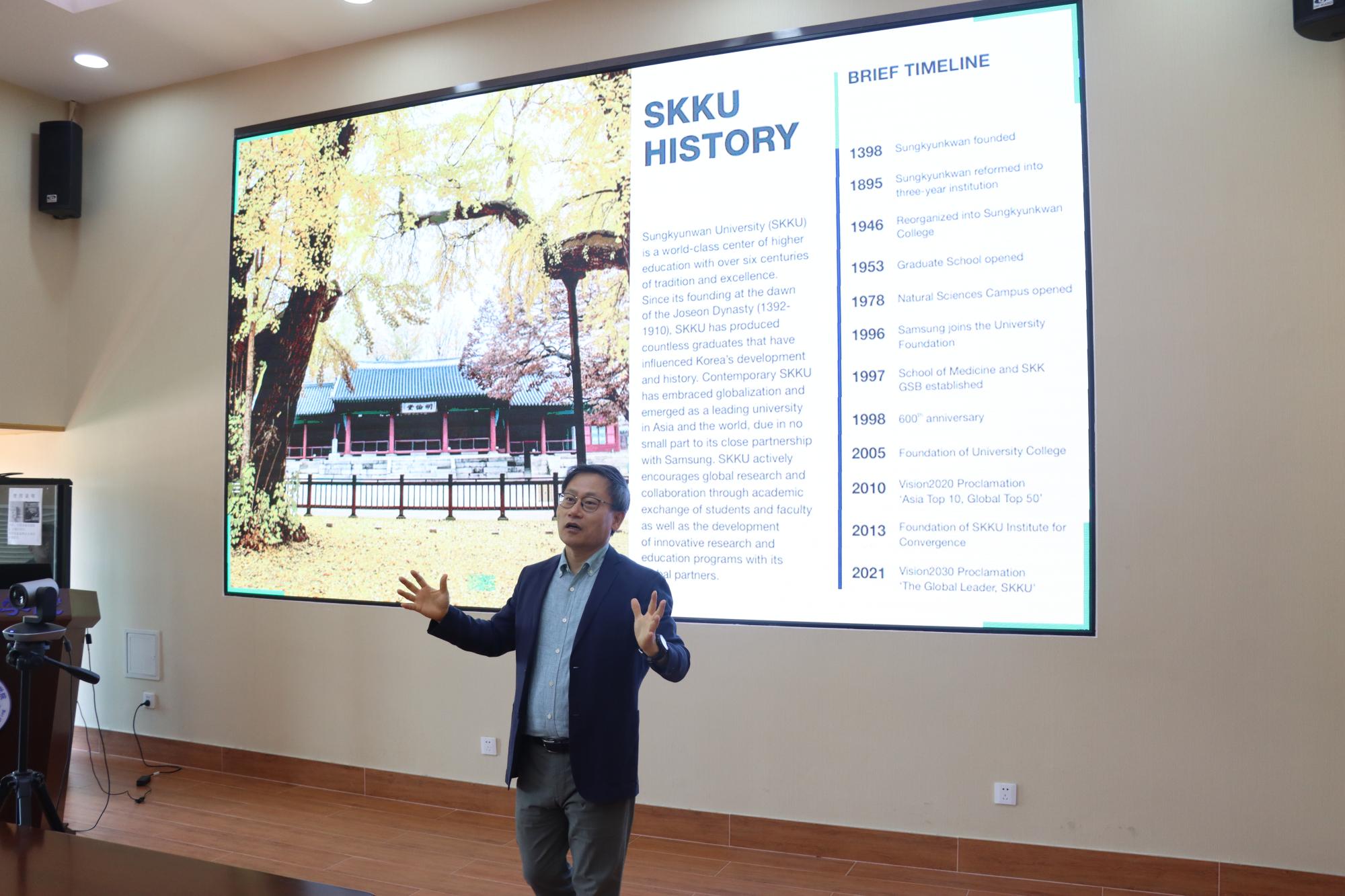 赵浩然介绍了学院的基本情况、科研成果以及科研团队,全炳宇介绍了成均馆大学基本情况,并详细介绍了成均馆大学信息通信学院电子电气工程的专业设置、人才培养特色和国际合作情况。