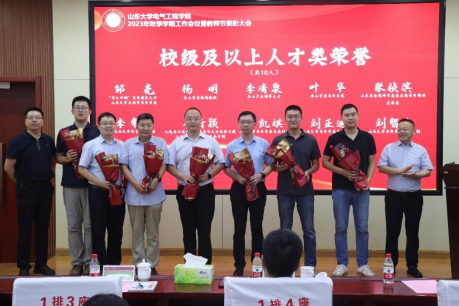 大会首先表彰了在2021-2022年度取得优异成绩,获得校级以上荣誉的优秀教师,殷录民和吕国凯向获奖教师颁奖。