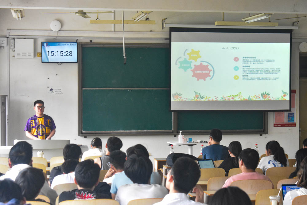 知识来自分享,经验源于交流。每位分享者都有着独到的成功经验:余果分享了备考时高效系统的复习方法;黄涛提醒同学们注重基础知识的掌握程度;范家宝鼓励求职学子积极与就业成功的前辈们交流经验,明确个人发展目标;宋梓良介绍了专项招聘计划的相关信息;秦佳巧则展示了面试的流程及大致内容。各位分享者的经验包罗万象、精彩纷呈,使同学们减轻了对未来就业的焦虑和迷茫,极大地提升了对就业中笔试面试的整体认知。