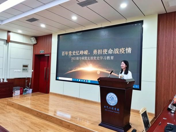 4月22日,2021级专硕党支部在电力楼四楼报告厅举行了“百年党史忆峥嵘,勇担使命战疫情”主题党日学习。主题学习以视频资料与主题演讲相结合的方式开展,主讲同学带领支部成员体会了革命先辈的崇高理想与伟大精神,同时结合电气学院的专业特色,一同分享了“国网山东电力检修公司带电作业班的副班长——王进”的优秀事迹。该主题党日活动将党史学习与时代楷模先进事迹相融合,汲取其中的精神,在支部内营造了青年大学生学党史、知党情、感党恩、跟党走的良好氛围。
