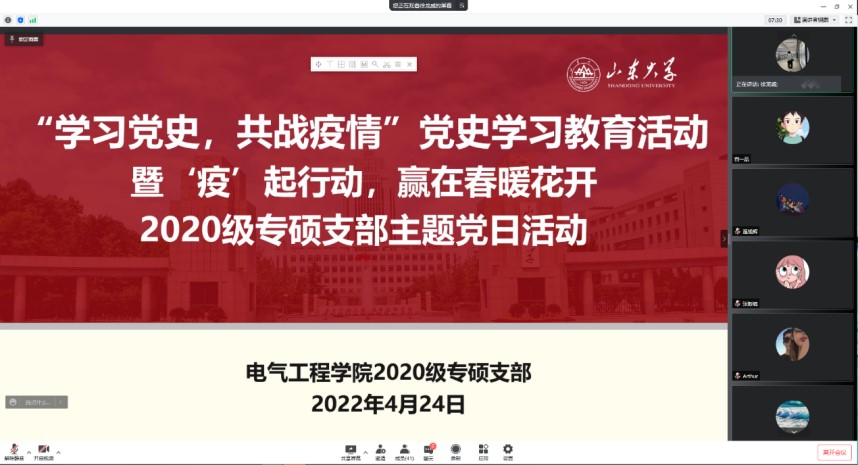 在活动中,支部成员们从1945年4月23日党的第七次全国代表大会的开幕开始,学习了在战乱动荡年代的中国青年的担当与作为。然后,以新时代我们面临的疫情大考为切入点,向支部的各位同志传递济南疫情信息,强调疫情形势的严峻性。之后,结合最近发布的《新时代中国青年》白皮书,支部成员们分享体会与感悟,传达国家对新时代的青年的希望与要求,表达作为新时代青年的我们的新担当与新作为。最后,同志们重温《yl23411永利集团官网全体党员倡议书》,勉励大家一起成为科学的防护者、抗疫的表率者、师生的服务者、环境的营造者。