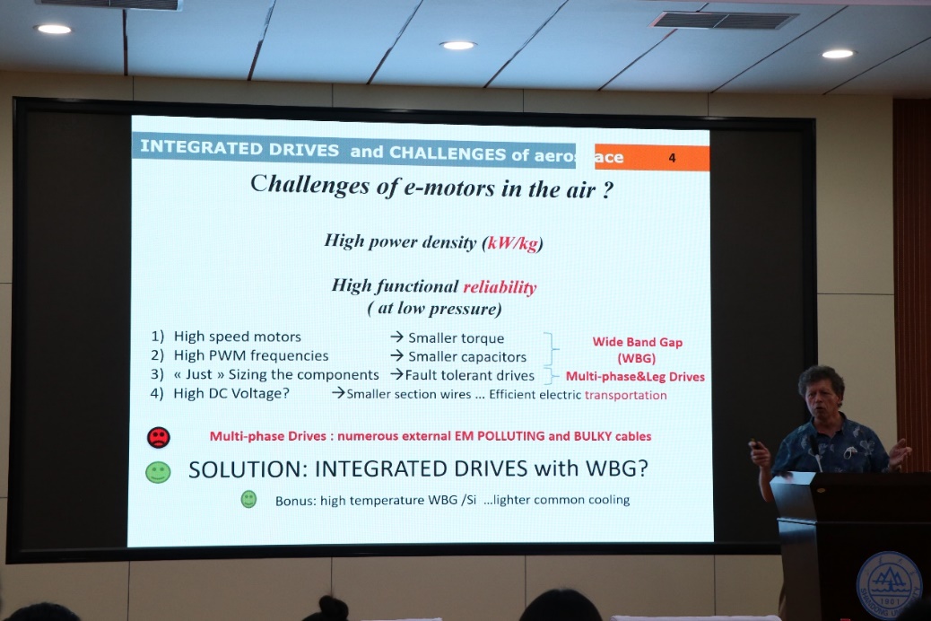 首先,Eric Semail教授作题为《Integrated Multiphase Drive and reliabilities, a WBG fault tolerant topology: Opportunities and Challenges for aerospace》的报告。他围绕航空航天电机的挑战、基于WBG的集成多相驱动器和集成多相驱动器的新型拓扑结构等几个部分展开。他指出:航空航天电机的一个主要挑战是在保持高可靠性的同时,实现高功率密度和高转矩密度(kW/kg, Nm/kg)。采用宽频带元件(WBG)的高开关频率电压源逆变器(VSI)可以减小直流母线电容的体积。但是,由于换相时间非常短(<50ns),对电压源逆变器与电机端之间的连接要求非常高。因此,为了获得更高的可靠性,在电机内部集成逆变器是非常有效的方式,这减轻了多相电机由于外接电缆过多而导致的容错缺点。此外,使用WBG元件,逆变器的温度限制可以高于150℃,接近电机的温度限制,有利于共同冷却,从而减少驱动系统整体重量。