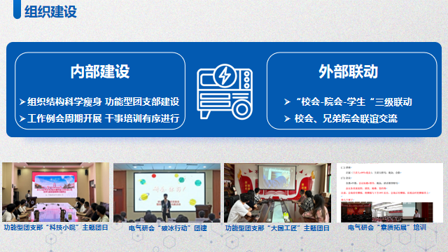 优化组织建设,提升工作能效。电气研会坚持“内建设、外联动”的组织建设思路,强化学生骨干的责任意识和能力担当。在内部建设方面:优化组织结构,精简人员规模,实现科学瘦身;严格遴选条件,规范培训制度,提高成员素质。在外部联动方面:建立完善“校会-院会-学生”三级联动体系,加强与校研会、兄弟学院研会的交流学习,不断提高电气研会服务力与凝聚力。