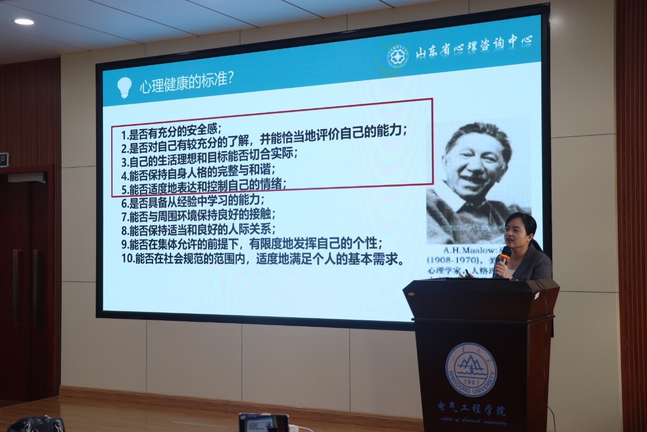 2021年11月25日下午2:00-4:00,由yl23411永利集团官网学生心理健康教育与咨询中心主办,yl23411永利集团官网承办的山大幸福课—心理健康讲座活动于电力楼四楼报告厅顺利召开。本次讲座有幸邀请到山东省精神卫生中心临床心理一科副主任王丽娜老师作为主讲嘉宾。学院党委副书记宋思利,研究生办公室主任宋济平,学校心理咨询中心许晓梅老师以及一百多名电气学子参与了本次讲座。
