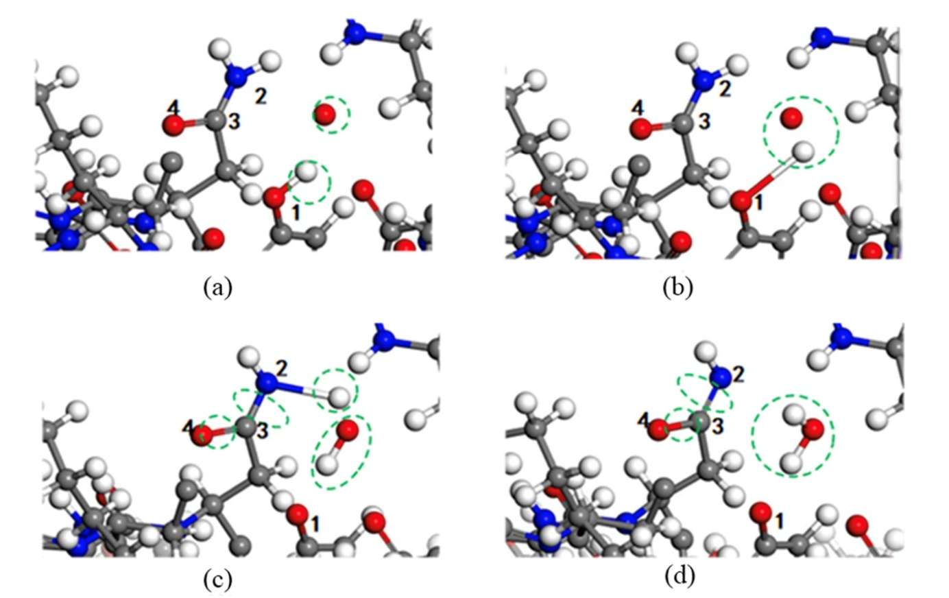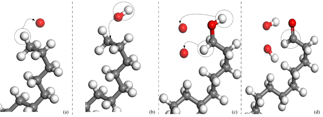 高压放电产生的等离子体中含有大量的高活性粒子,这些活性粒子既有带电的也有中性的,本文利用反应分子动力学模拟方法研究了大气压等离子体中产生的活性氧粒子(ROS),如基态O原子、OH自由基和O3分子,以及植物油中主要活性成分脂肪酸在ReaxFF力场作用下的反应过程,在原子水平上深入探讨了在活性粒子氧化脂肪酸分子的化学键断裂和形成的过程。比如等离子体中提供的基态氧原子可以使得原烃链末端的甲基形成一个烷基自由基,同时伴随着一个OH自由基的生成(如图2(a)和(b))。随后,这个OH自由基附着在已形成的烷基自由基上,在图2(c)中形成一个醇基。该反应还可以进一步进行,最终形成一个醛基(见图2(d))。在脂肪酸分子上观察到醛、醇等含氧官能团的生成,这与实验中观察到的PAO分子结构的变化结果相一致。根据计算数据,文章给出了在活性氧影响下PAO的最终产物。该研究揭示了等离子体活性粒子作用下液体内化学键的断裂与生成,及新活性基团的合成。通过放电等离子体处理水、溶液、油脂等液态物质,可以有效地将需即时产生、即时使用的等离子体活性粒子转化为种类多、存储周期长的活性基团,从而为等离子药学的发展提供可能。