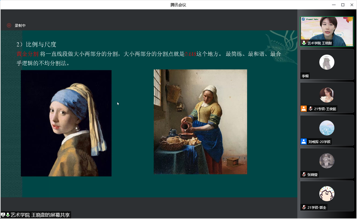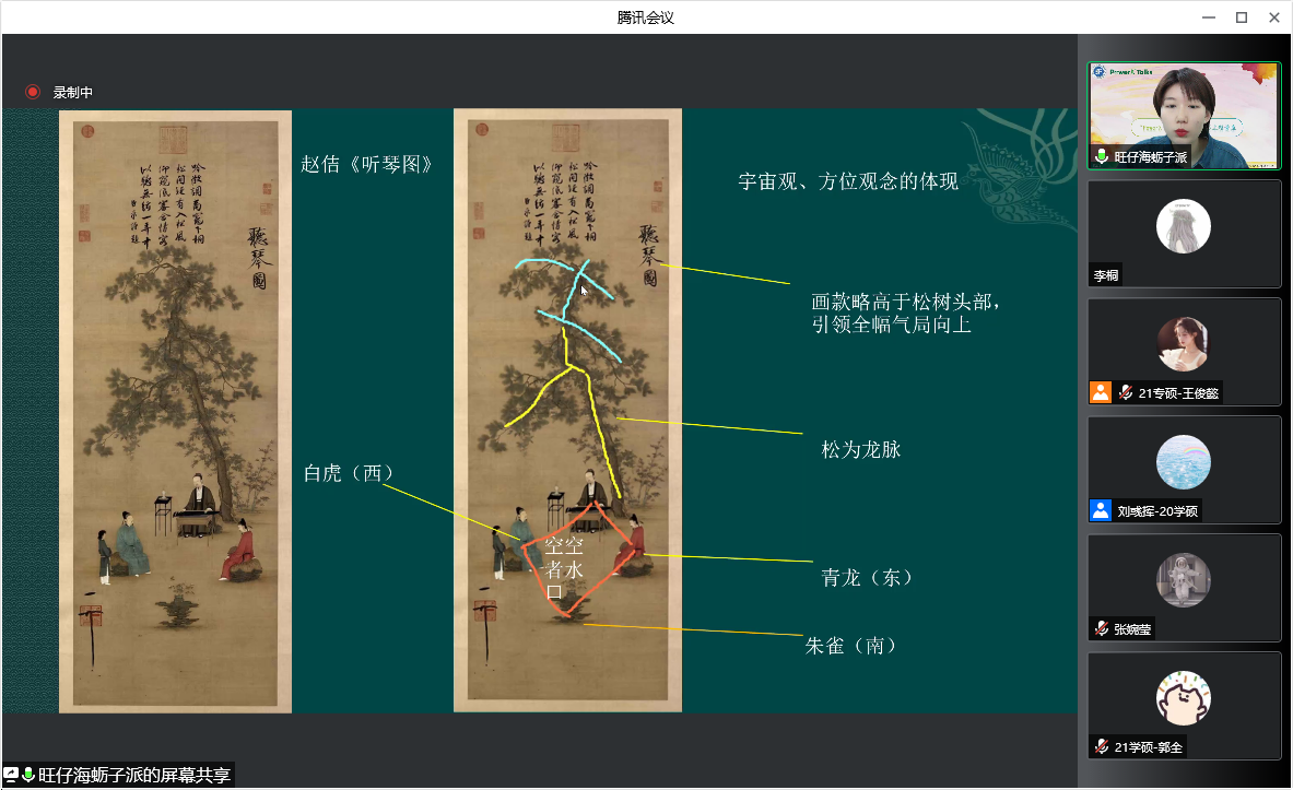 首先,王晓甜以“跨越边界——从艺术家的眼睛看绘画”为主题讲解了如何从构图和观看方式的角度来鉴赏绘画作品。她从构图的含义、基本原则(统一与变化、比例与分割、对比与调和、整体与局部、平衡与均衡)、绘画画幅形式等几方面对绘画知识作了简要介绍,重点根据十点构图方式对中国绘画的构图进行了细致分析,并对古代和现当代绘画构图传统案例进行分享,最后王晓甜为同学推荐了纪录片《我在故宫修文物》、小程序中华珍宝馆等,便于同学们日常增强自己的艺术修养。
