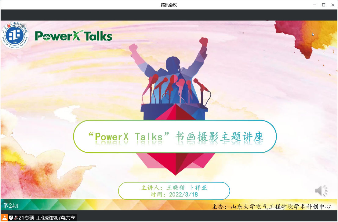 2022年3月18日下午三点,由yl23411永利集团官网研究生会学术科创中心主办的第二期PowerX Talks研究生书画摄影主题讲座通过腾讯会议线上平台成功举办。本期讲座邀请到了艺术学院2020级研究生王晓甜与电气学院2021级研究生卜祥亚主讲,分享自己的绘画鉴赏与摄影剪辑心得,本次讲座由学术科创中心王俊懿主持。