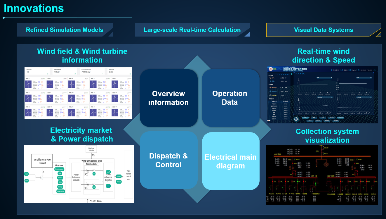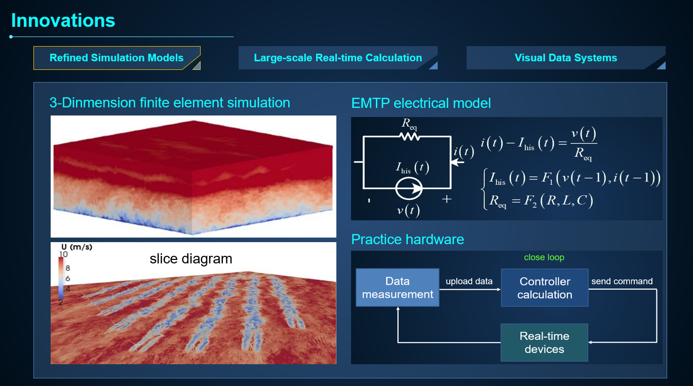 “风电场数字孪生系统”是一套用于实现风电场数字映射的完整软硬件方案。它能够准确捕捉风电场宽尺度主要动态特征,包括机组间风场空气动力学耦合(尾流效应)、电气耦合(集线系统)以及信息耦合(控制系统)。同时,系统具备与实际风电场同步交互的能力,可基于实测和仿真数据对风电场参数进行实时更新校正。该系统可以辅助风电场运营商通过全生命周期的优化运行控制,提高发电量、实现智能运维;可以辅助电网复现和分析风电场并网稳定性问题,助力高比例新能源电力系统的深入研究。